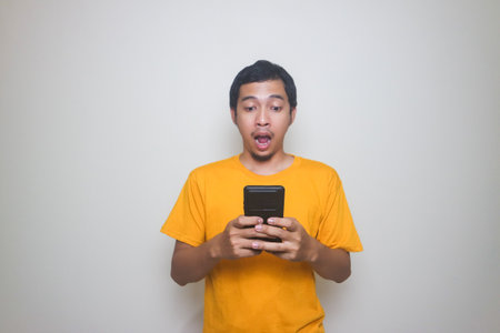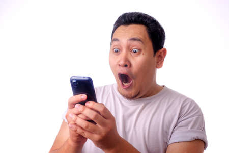 Wow and shocked face expression of young Asian Malay man looking at the smartphone screen on isolated white background.