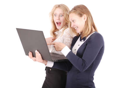 Two shocked girls using laptop isolated on a white background