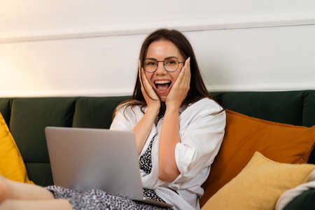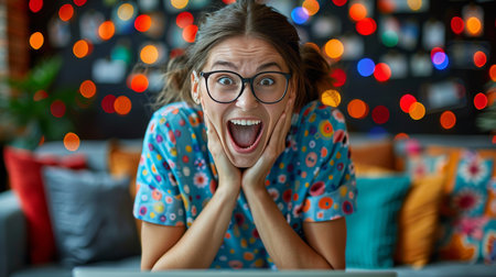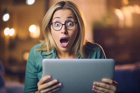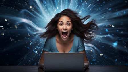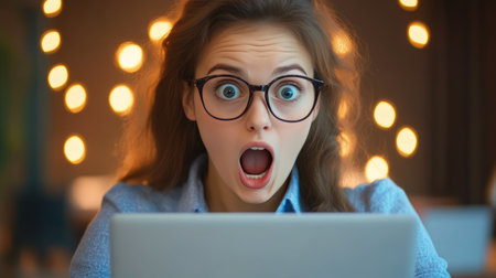 Young woman amazed and shocked by internet news search