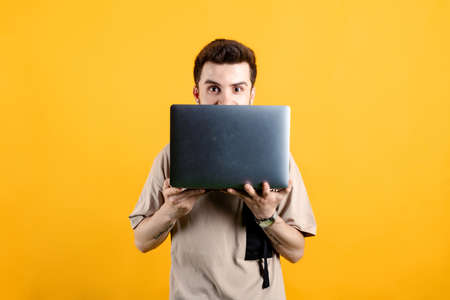 Handsome young man wearing casual clothes posing isolated over yellow background peeking out from behind laptop, looking surprised at camera.