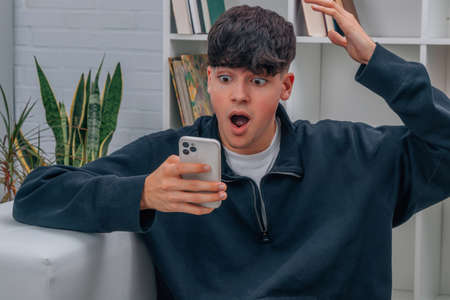 teen boy at home astonished looking at mobile phone