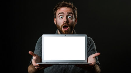 A shocked man is holding a laptop with an empty white screen. Laptop mockup. He looks surprised, shocked, and distracted. The concept of panic, fear, and excitement. Sale of laptops. Website advertising