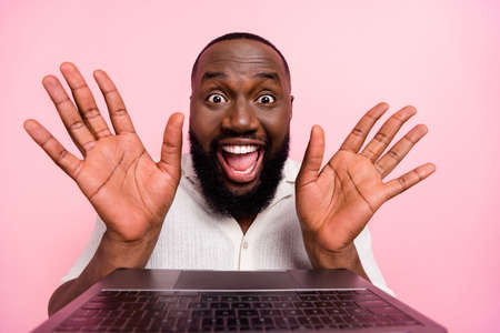 Photo of sweet excited young man wear white shirt typing modern device rising arms palms isolated pink color background