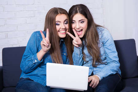 happy teenage girls video chatting with somebody on laptop
