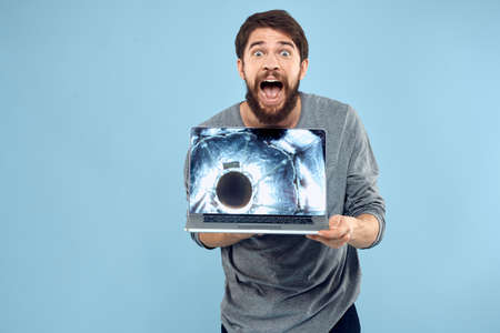 Bearded man laptop in hand internet wireless technology emotions blue background