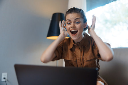 Excited young woman celebrating success while working on a laptop at home, wearing a casual brown dress, vibrant emotions, modern interior design