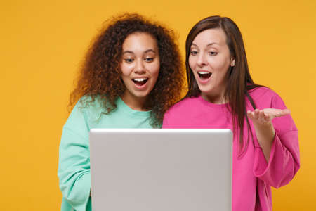 Two excited women friends european and african american girls in pink green clothes posing isolated on yellow orange background. People lifestyle concept. Mock up copy space. Hold laptop pc computer.