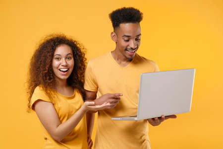 Cheerful young friends couple african american guy girl in casual clothes isolated on yellow orange background. People emotions lifestyle concept. Mock up copy space. Pointing on laptop pc computer.