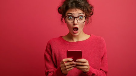 A shocked young woman reacts in surprise while reading something on her smartphone. The vibrant pink background enhances her startled expression, capturing a moment of astonishment.