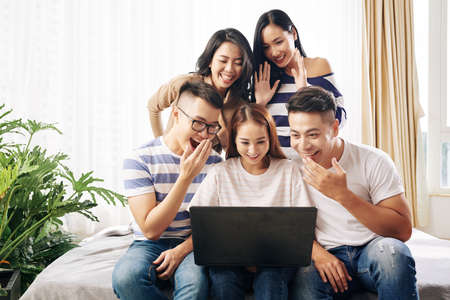 Vietnamese young people laughing when watching videos online on laptop screen