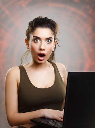 Surprised young woman with laptop computer in front of abstract background