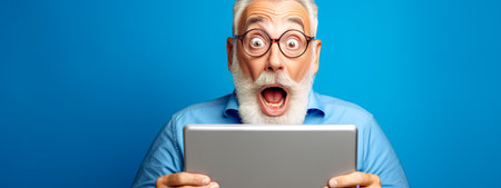 older adult with a look of astonishment, eyes wide and mouth open, holding a tablet, set against a bright blue background, portraying a common reaction to surprising or newsworthy content digital age
