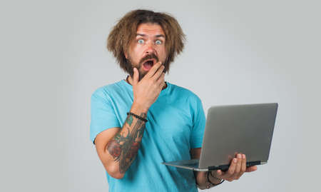 Surprised man with laptop. Work from home. Bearded guy working on pc computer. Freelancer.