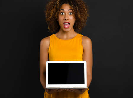 Beautiful African American woman holding and showing something on a laptop