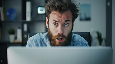 modern man on laptop with eyes wide open,