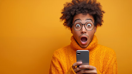 close up young man very surprised happy while looking at a phone isolated on a yellow color background