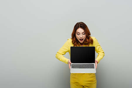 amazed woman with curly hair holding laptop with blank screen on gray