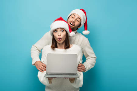 curious man in santa hat looking at laptop near amazed woman on blue