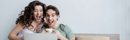 excited young couple looking at laptop in bedroom, banner