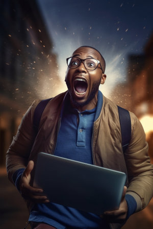 Generative AI : Success and achievement Young overjoyed african american man looking at laptop screen with excitement feeling excited after receiving job offer by email or exam res