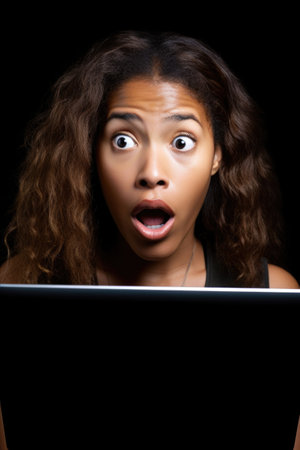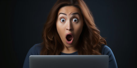 portrait of a young woman looking surprised while using her laptop
