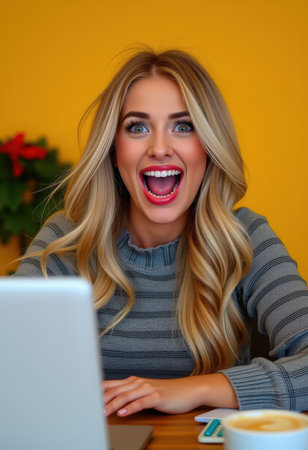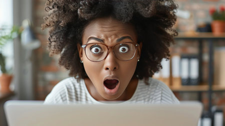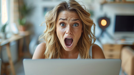 Generative AI : Shocked woman freelancer looks in amazement at laptop screen and covers her mouth with hands in surprise while sitting at desk in home office