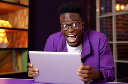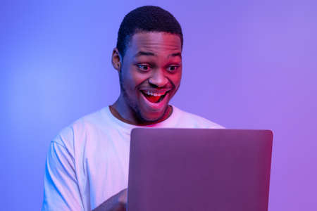 Closeup Shot Of Excited Black Guy Using Laptop Computer Under Neon Lighting, Joyful African American Man Looking At Computer Screen With Amazement, Standing Over Purple Background, Free Space