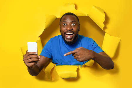 Shocked african american man holding cellphone and pointing on it, standing through yellow paper torn hole
