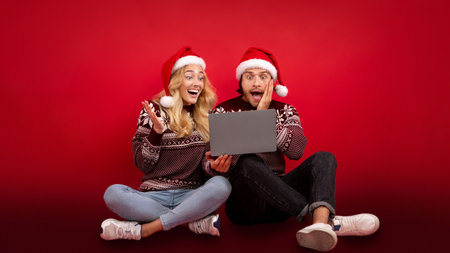 Young couple excited over Christmas discounts sitting with laptop on red background