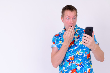 Portrait of young tourist man using phone and looking shocked