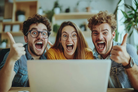 Three friends are joyfully posing together with a laptop in a vibrant and energetic setting filled with colors
