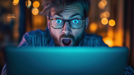 An astonished man with glasses stars at a luminous laptop screen, his face lit with a blue glow amidst a backdrop of night-time bokeh lights.
