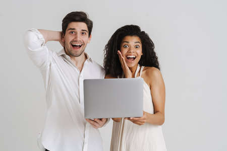 Multiracial excited couple posing with laptop and screaming isolated over white background