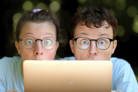 A couple with glasses sits closely together, staring in astonishment at a laptop outdoors, clearly intrigued.