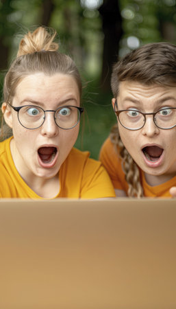 Two surprised friends gaze at a laptop screen in nature, showing their shocked expressions and excitement.