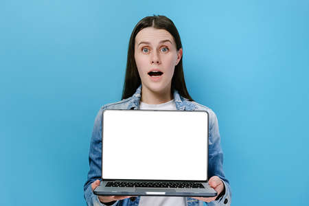 Excited young woman holding on laptop pc computer, shocked looking at camera, dressed in denim jacket, posing isolated on blue studio background wall. People lifestyle concept. Mock up copy space