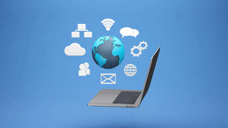 3D render illustration. Digital small business concept. notebook with business element and icon on blue background.