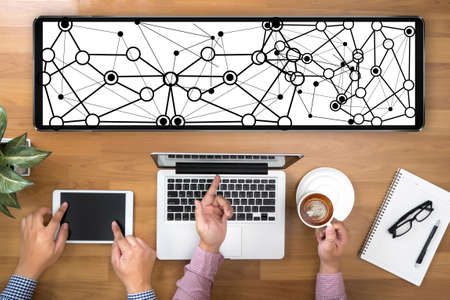 CONNECT (Connected Communication Connection Media) Two Businessman working at office desk and using a digital touch screen tablet and use computer, top view