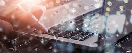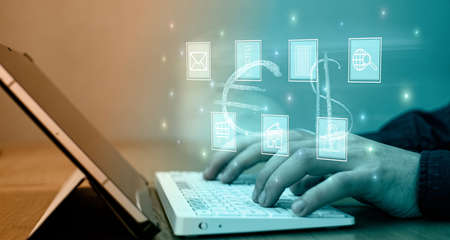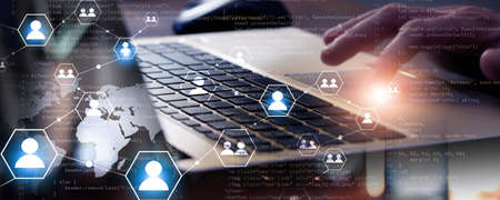 Man working on computer keyboard with graphic of internet network modernization showing concept of 5G wireless connection and social media .