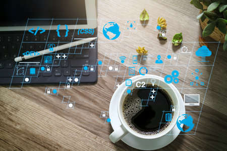 Coding software developer work with AR new design dashboard computer icons of scrum agile development and code fork and versioning with responsive cybersecurity.Coffee cup and Digital table dock smart keyboard