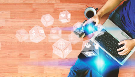 Man using laptop and hand touch screen smart phone with social icons, Social media concept.