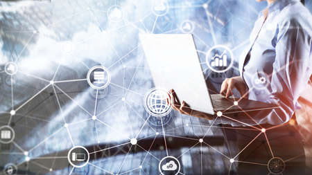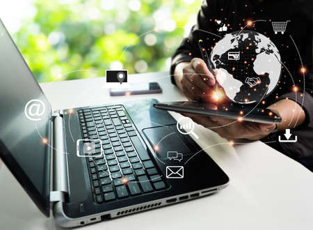 Businessman using laptop and virtual touch screen o do online transactions with internet technology, concept of global data connection by internet technology, big data, searching for marketing information