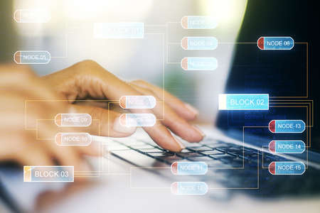Multi exposure of woman hands working on computer and data theme hologram drawing. Tech concept.