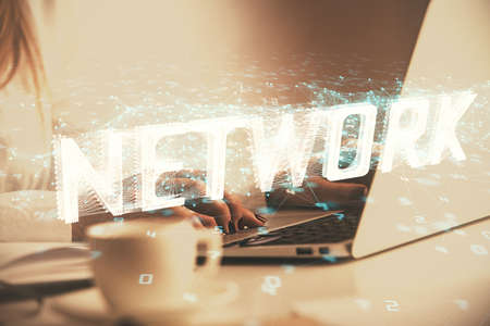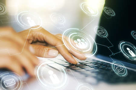 Social network concept with hands typing on laptop on background. Multiexposure