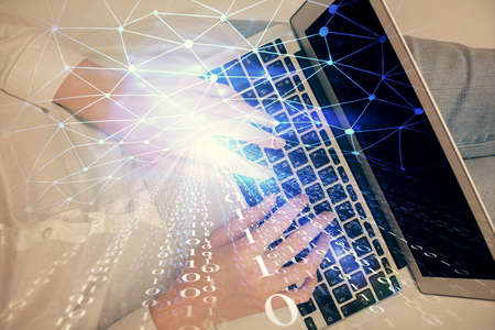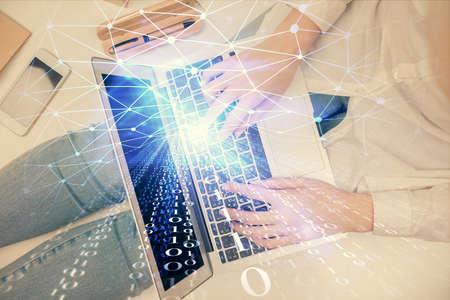 Double exposure of woman hands working on computer and data theme hologram drawing. Top View. Technology concept.