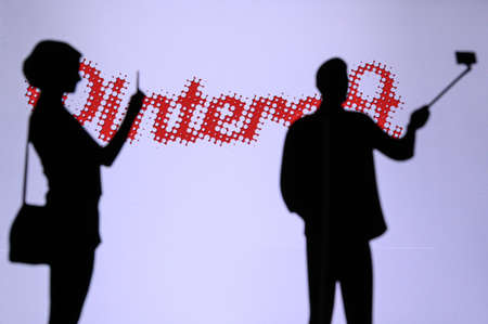 NEW YORK, USA, 25. MAY 2020: Pinterest American image sharing and social media service Man and Woman taking a photo on mobile man use selfie stick. Company logo on screen in background