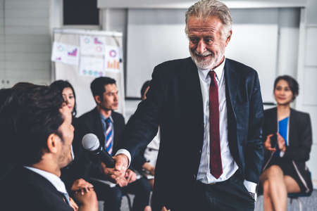 Senior leader speaker speaks to public people audience in training workshop or conference. Mature lecturer is CEO executive manager leading the symposium event. International business seminar concept.