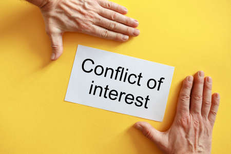 Man's hands holding a card with the inscription Conflict Of Interest on a yellow background