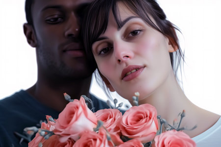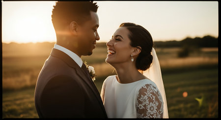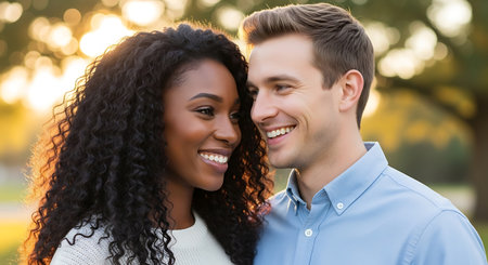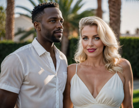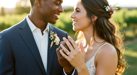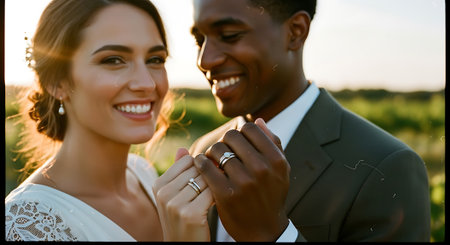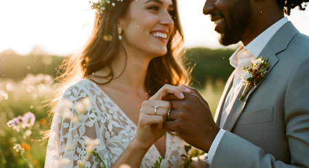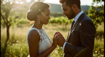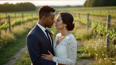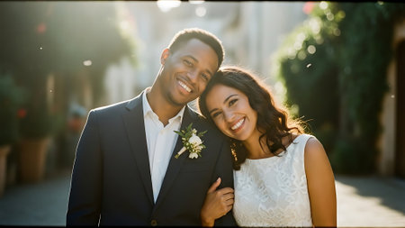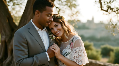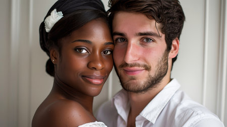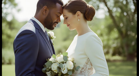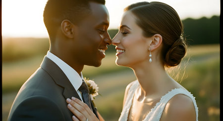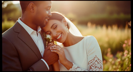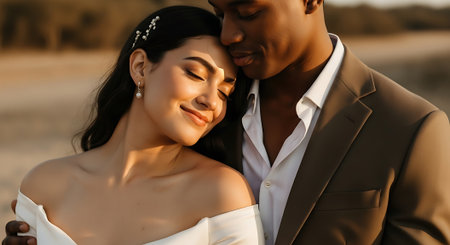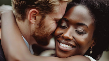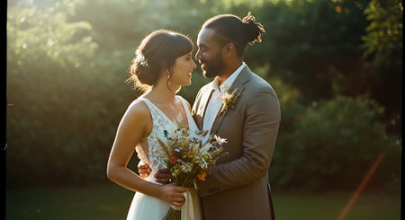 This image was generated using AI. A multiracial couple poses in close-up during their wedding, embracing and smiling in a natural setting with a blurred floral background. The warm light and vibrant colors enhance the romantic, intimate, and festive atmosphere. Ideal for editorial, travel, and commercial content about multicultural celebrations, including love, and wedding portraits.