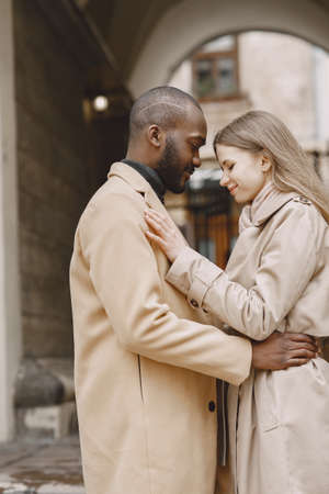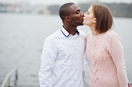 Happy multiethnic couple in love story. Relationships of african man and white european woman.